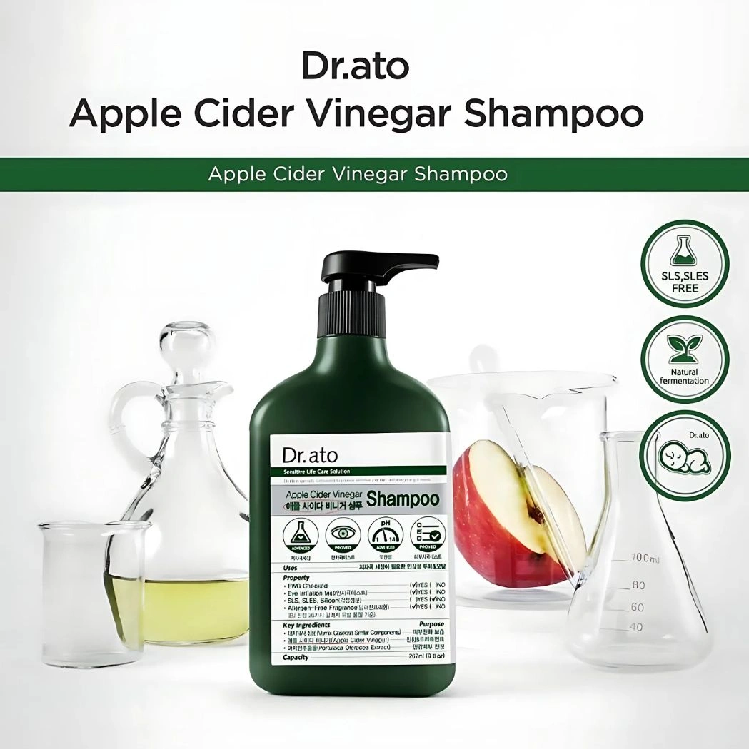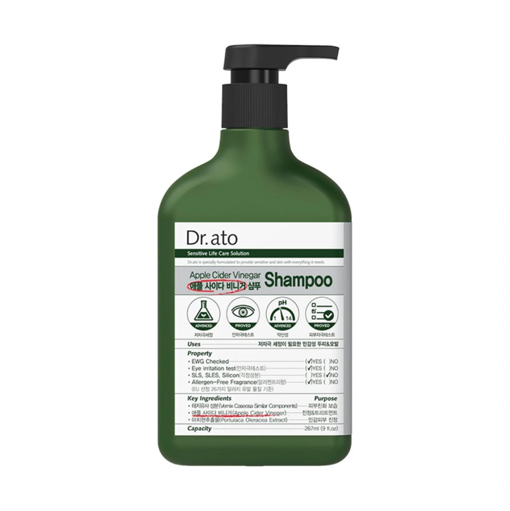- Dr. Ato’s apple cider vinegar hypoallergenic shampoo is made with naturally fermented apple cider vinegar and detergents that come from nature.