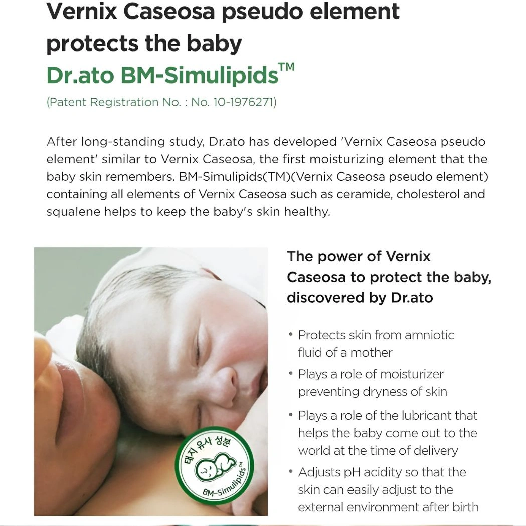 - BM-SimulipidsTM, Dr. Ato’s patented ingredient, is like vernix, a natural moisturizing film that covers a baby’s skin for 10 months while the baby is still in the womb.