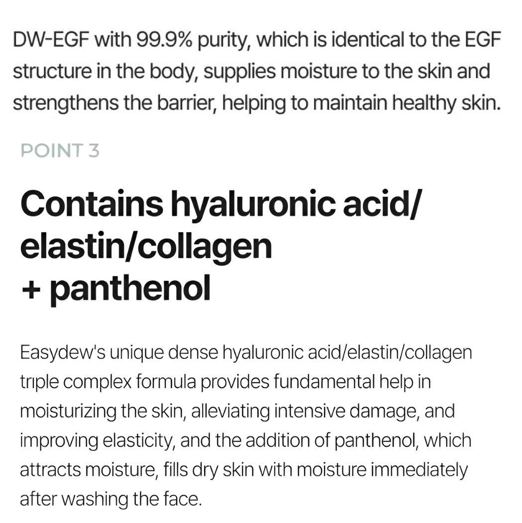 - The 6-layer ceramide provides hydration, and the 99.9 per cent pure DW-EGF nourishes the skin and fortifies its barrier. The essential ingredients—hyaluronic acid, elastin, collagen, and panthenol—help to hydrate the skin. Moreover, it reduces intense damage, increases elasticity, and fills dry skin with moisture right after washing it.